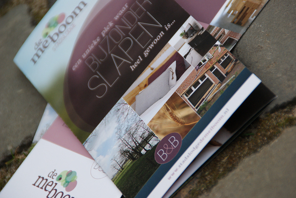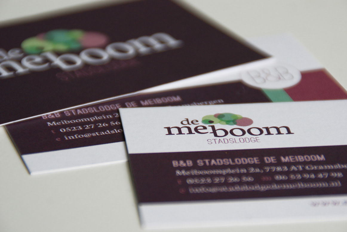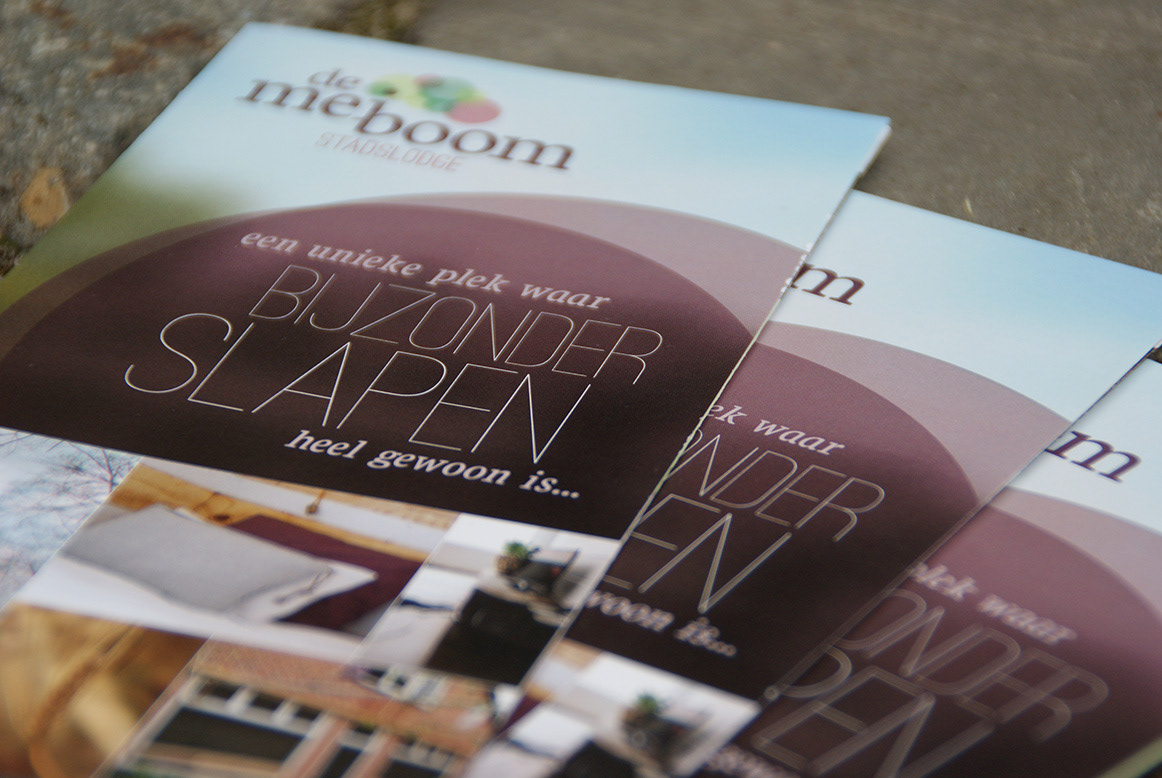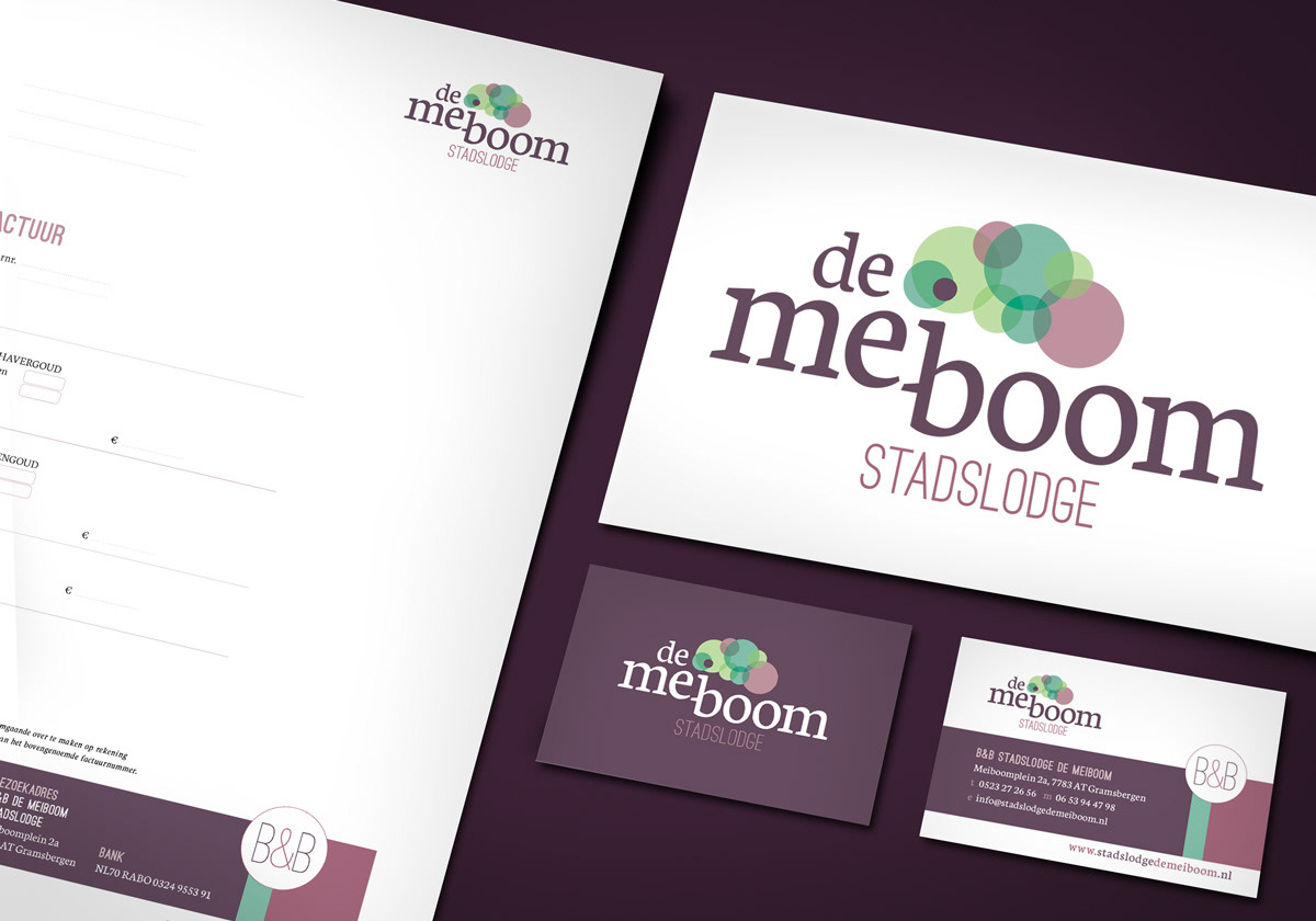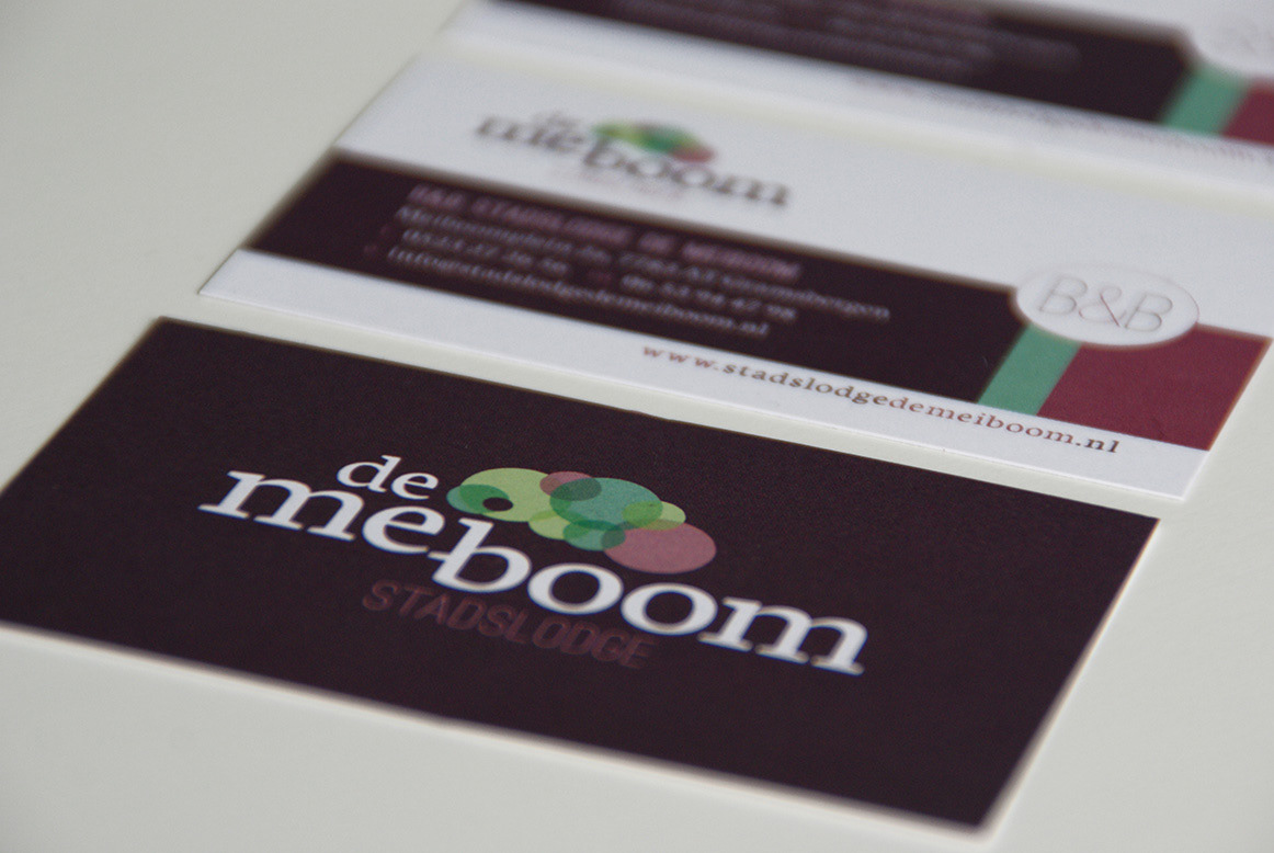 Concept en ontwerp visuele identiteit: logo, folder, website tot buitenreclame. Het ontwerp is gebaseerd op een (mei)boom. Het kleurgebruik sluit aan bij het eigen gezicht van de Meiboom stadslogdge, een B&B dat zich richt op het midden – hoger segment. Het resultaat is een sterke visuele identiteit, waarvan een gaaf logo ontwerp is toegepast op diverse uitingen.